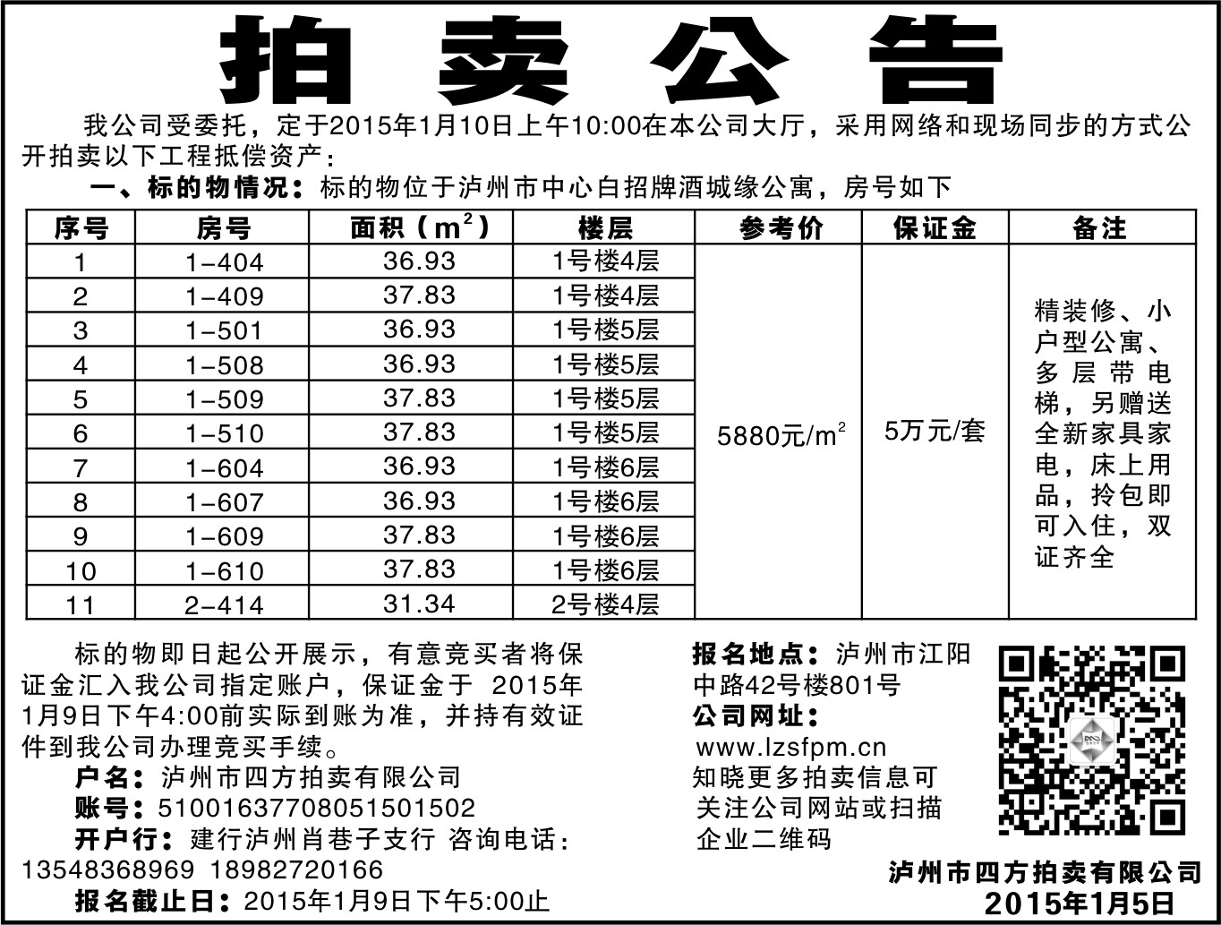 當(dāng)前位置:網(wǎng)站首頁 > 新聞資訊 > 公司動態(tài)2015年1月10日拍賣公告
